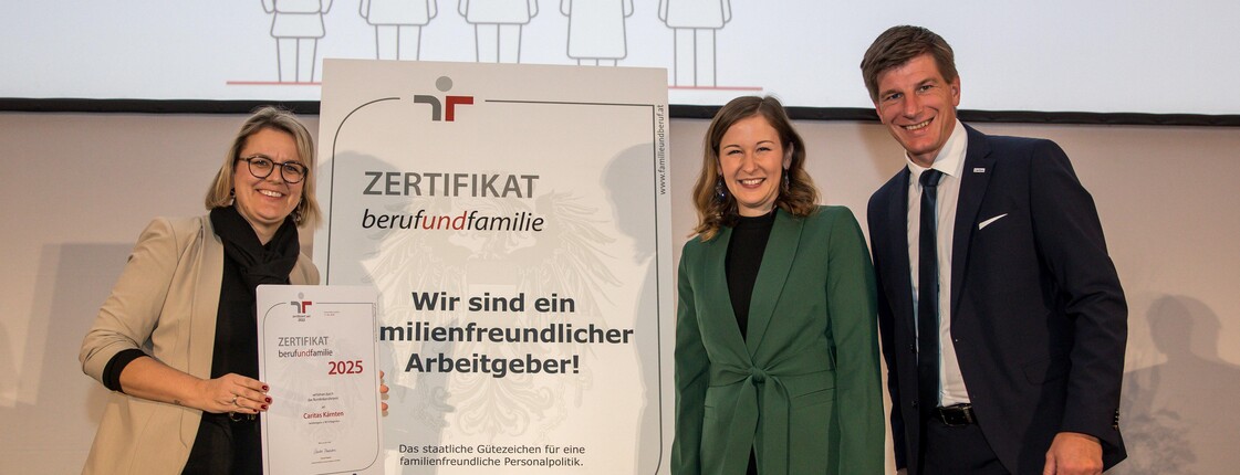 Wir als Caritas Kärnten stehen für Tatkraft, Herzlichkeit und ein oft auch herausforderndes Eintreten für benachteiligte Menschen. Mit rund 1.200 Mitarbeiter*innen und mehr als 500 Freiwilligen sind wir nicht nur eine kraftvolle Organisation, die an über 100 Orten in Kärnten und mit ihrer Auslandshilfe in vielen Ländern weltweit Menschen stärkt und Gesellschaft mitgestaltet, sondern auch seit mittlerweile drei Jahren eine „ausgezeichnete“ familienfreundliche Arbeitgeberin. „Die Vereinbarkeit von Beruf und Familien für unsere Mitarbeiter*innen liegt uns besonders am Herzen. Mit der Rezertifizierung berufundfamilie, also dem staatlichen Gütezeichen für eine familienbewusste Personalpolitik, haben wir bestätigt, dass wir eine attraktive Arbeitgeberin sind. Unsere Leistungen in diesem Bereich aus den letzten Jahren werden belohnt, und weitere Maßnahmen für die Zukunft sind in Ausarbeitung“, freut sich Marion Auer-Fercher, unsere kaufmännische Geschäftsführerin.