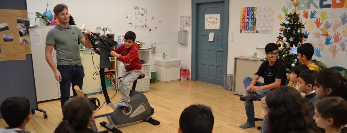 Workshop-Leiter Michael Vögel holt die Kinder und Jugendlichen direkt in ihrer Lebenswelt ab. „Was macht ihr in der Früh als erstes?“ Handy einschalten, Licht machen, Zähne putzen, Kakao kochen – all dies wäre sehr beschwerlich, wenn der Strom dazu nicht so selbstverständlich aus der Steckdose kommen würde. illwerke vkw-Mitarbeiter Michael Vögel klärt auf, welche Möglichkeiten zur Stromproduktion es gibt und bezieht die Schüler*innen mit ein. Das Thema wird nicht nur theoretisch, sondern auch praktisch, mittels verschiedener Spiele und Geräte behandelt. So kommt beispielsweise ein Energiefahrrad zum Einsatz: Für die Kids bedeutet das, ordentlich in die Pedale zu treten, um etwa eine Glühbirne zum Leuchten zu bringen oder einen Haar-Fön, beziehungsweise einen Wasserkocher in Betrieb zu nehmen.