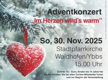 „Im Herzen wird’s warm“: Unter dieses Motto stellen die beiden Caritas Einrichtungen der Mobilen Pflege in Waidhofen ihr diesjähriges Adventkonzert. Fünf Musikgruppen stellen sich in den Dienst der guten Sache und singen und musizieren unentgeltlich zu Gunsten der mobilen Pflege und Betreuung der Caritas in der Stadtpfarrkirche Waidhofen an der Ybbs am 30.11.25. Beginn ist um 15:00 Uhr.